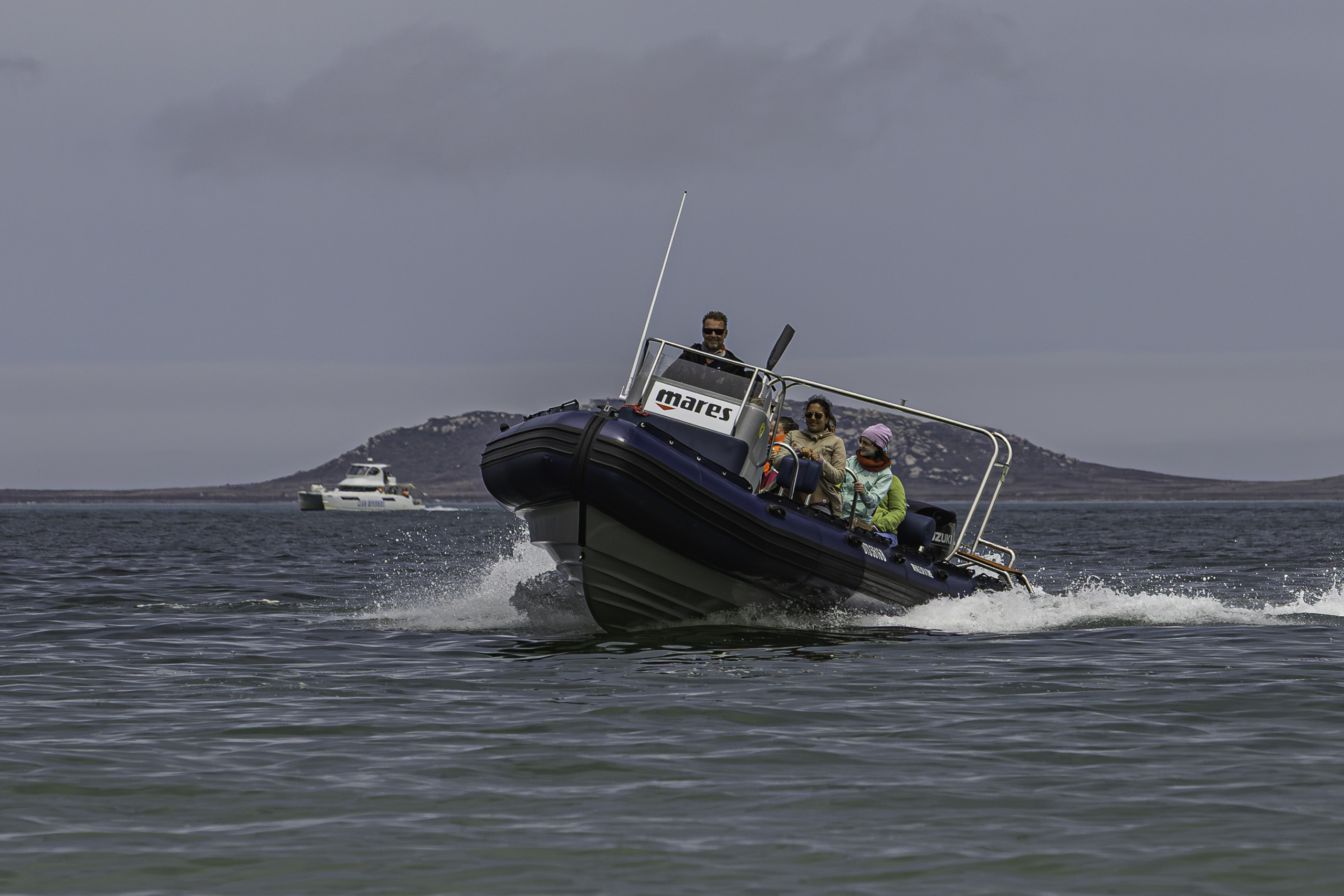 Here, the ocean reveals its own version of a “Big Five.” Instead of lions and elephants, the Atlantic offers encounters with some of the most extraordinary marine animals in the world. Humpback whales move along the coastline during their long migrations, while southern right whales often pause in calmer coastal waters. Bryde’s whales patrol offshore areas year-round, appearing quietly in the deeper blue. Pods of dolphins frequently pass through the region, energetic and playful, sometimes riding the pressure wave beside the boat. Cape fur seals gather on nearby islands and rocky outcrops, and on rare and unforgettable occasions the ocean’s most powerful hunters, orcas, may appear, moving silently through open water.